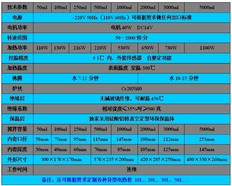 產(chǎn)品介紹ZNCL-T-C型 智能磁力(電熱套)攪拌器 每種容量的具體的技術(shù)參數(shù):